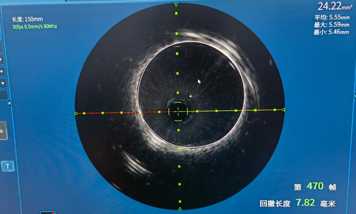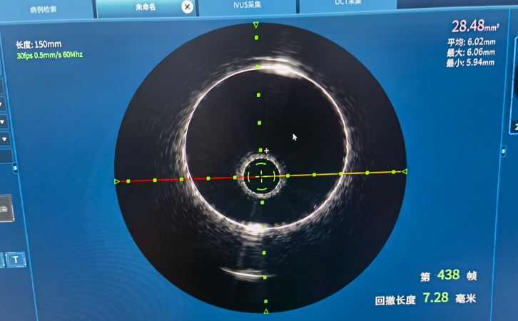 测试步骤: 1)安装原软件2.0.0.8的基础上,用2.0.3.1版本覆盖,且重置配置文件; 2)测量横向几何位置精度2mm、图像几何畸变不通过,回退软件版本到2.0.0.8测量通过; 3)使用6mm直径管腔测试工装,管腔面积理论职位28.27平方毫米,分别在新旧版本软件对比测量,新版本软件测量直径6mm的工装管腔面积为24.22平方毫米,旧版本软件测量直径6mm的工装管腔面积为28.48平方毫米。 2.0.0.8测量图片: 2.0.3.1测量图片: